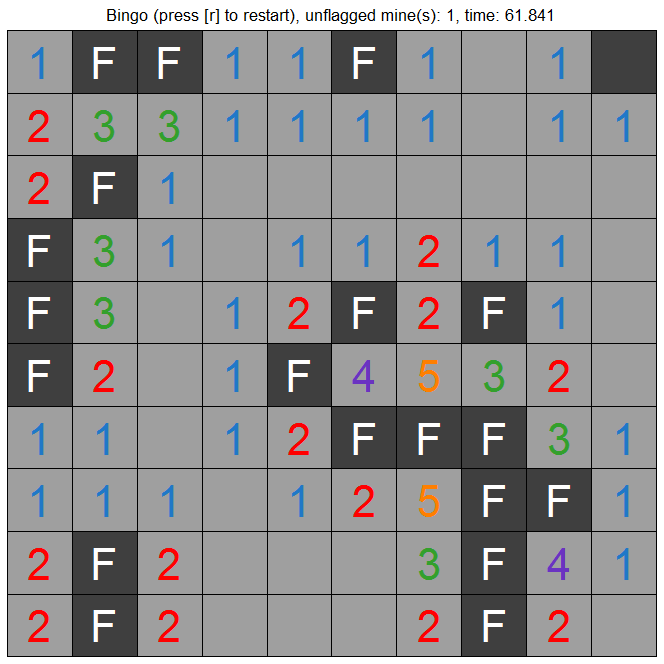 Let’s have fun with R! This is the very popular mine sweeper game! In this game, you are required to find out tiles that contain mines through clues from unmasking neighboring tiles. Each tile that does not contain a mine shows the number of mines in its adjacent tiles. If you unmask all tiles that do not contain mines, you win the game; if you unmask any tile that contains a mine, you lose the game. While in R, you may also run library(mineSweepR); help(run_game) and check details for game instructions.