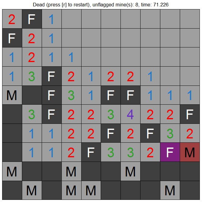 Strings as colors for unmasked tiles / masked tiles / mine-triggering tile / wrongly flagged tiles.