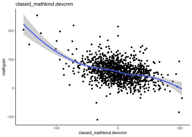 fit2 <- lmer(mathgain ~ classid_mathkind.devcmn + classid_mathkind.cmn + (1|classid), instruction)