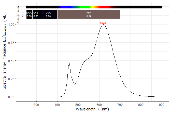 #> Spectral data in s.e.irrad normalized to 1 at 728.8 nm (max in 251.29-900.1 nm)