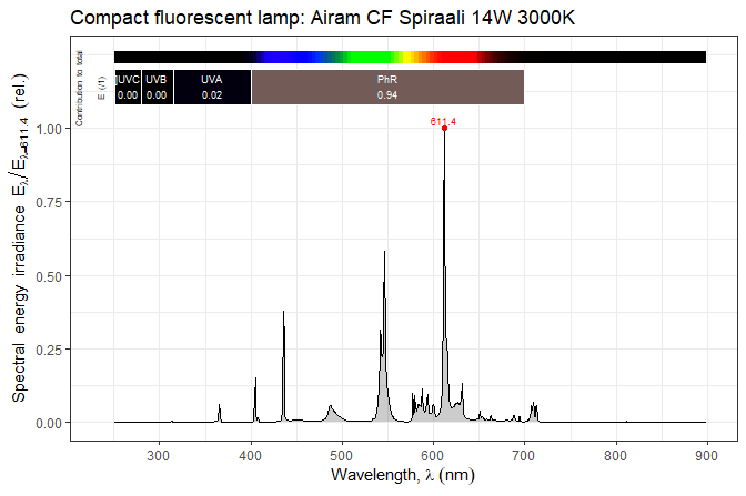 autoplot(lamps.mspct$Airam.CF.Spiraali.14W.3000K, geom = "spct",