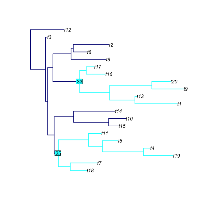 subtreeShow(rtree(20),nodeList=c(25,33), mainCol="navy", subtreeCol="cyan", nodeLabelCol="cyan", edge.width=2)