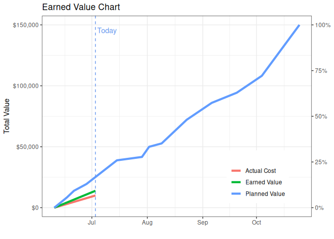 #> 1 98081.17 -60147.17 0.97The Earned Value can then be plotted in the following way.