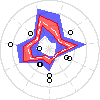 The radar-boxplot draws two different colored regions representing the same a boxplot would, but for multiple attributes at once. The inner red region represents the 25-75% percentiles of each attribute, while the blue area represents the total range, excluding the outliers as defined by Tukey (1977). Outliers appears as points, just like the classic boxplot and are defined with the formulas: