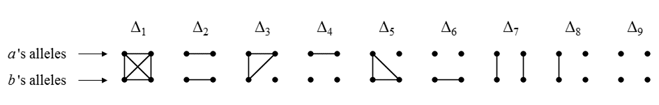 The following figure shows the 9 condensed identity states of two individuals a and b. Each state shows a pattern of identity by descent (IBD) between the four homologous alleles. The four alleles are represented as dots, with a connecting line segment indicating IBD. The states are shown in the ordering used by Jacquard and most subsequent authors.