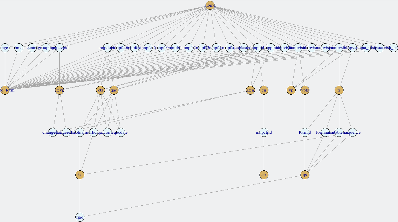 Linkages amongst forms can be explored with the links_secuTrial function. This relies on the igraph package to create a network. It is possible to interact with the network, e.g. move nodes around in order to read the labels better. The device ID is returned to the console, but can be ignored. Forms are plotted in deep yellow, variables in light blue.