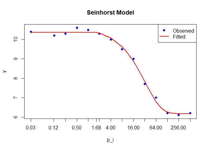 The goal of seinfitR is to fit the Seinhorst equation to experimental data describing the relationship between preplant nematode densities and plant growth using nonlinear least squares fitting.