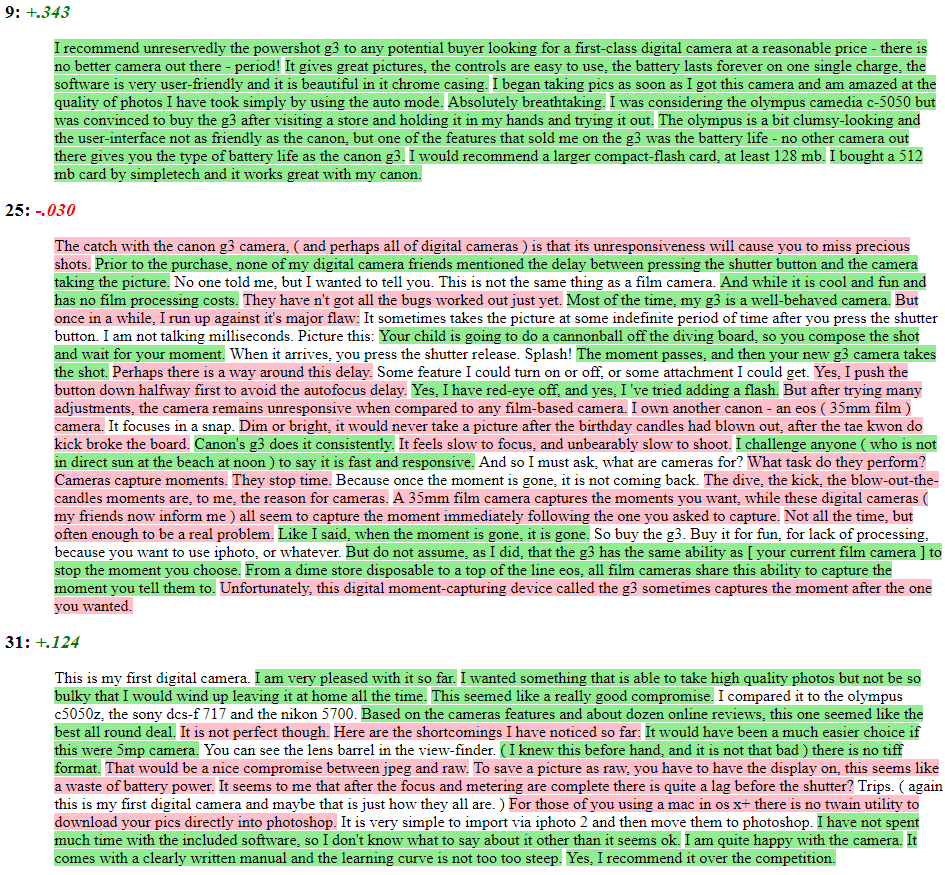 Here we look at three random reviews from Hu and Liu’s (2004) Cannon G3