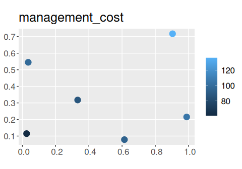To perform the optimization, we will set a total budget for (i) protecting sites and (ii) surveying sites. Although you might be hesitant to specify a budget, please recall that you would make very different plans depending on available funds. For instance, if you have near infinite funds then you wouldn’t bother conducting any surveys and simply protect everything. Similarly, if you had very limited funds, then you wouldn’t survey any sites to ensure that at least one site could be protected. Generally, conservation planning problems occur somewhere between these two extremes—but the optimization process can’t take that into account if you don’t specify a budget. For brevity, here we will set the total budget as 90% of the total costs for protecting sites.