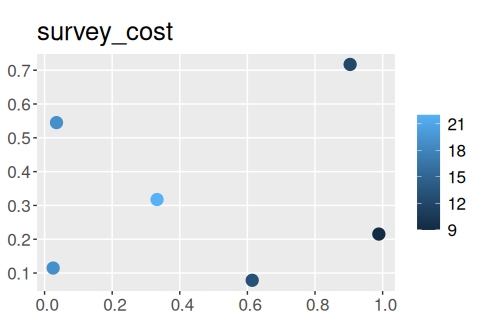 This has just been a taster of the surveyvoi R package. In addition to this functionality, it can be used to evaluate survey schemes using value of information analysis. Furthermore, it can be used to generate survey schemes using conventional approaches (e.g. sampling environmental gradients, and selecting places with highly uncertain information). For more information, see the package vignette.
