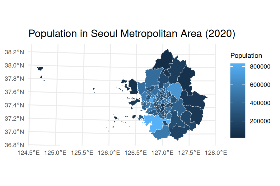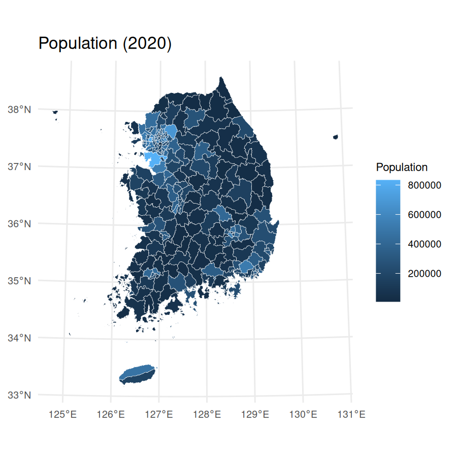 # tidycensuskr.sf::load_districts(year = 2020)Package vignettes are the first place to look for detailed examples. Below are some quick examples to get you started.