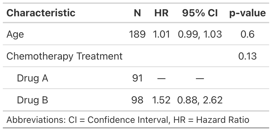 #> age 0.006 0.010 1.01 0.99, 1.03 0.56