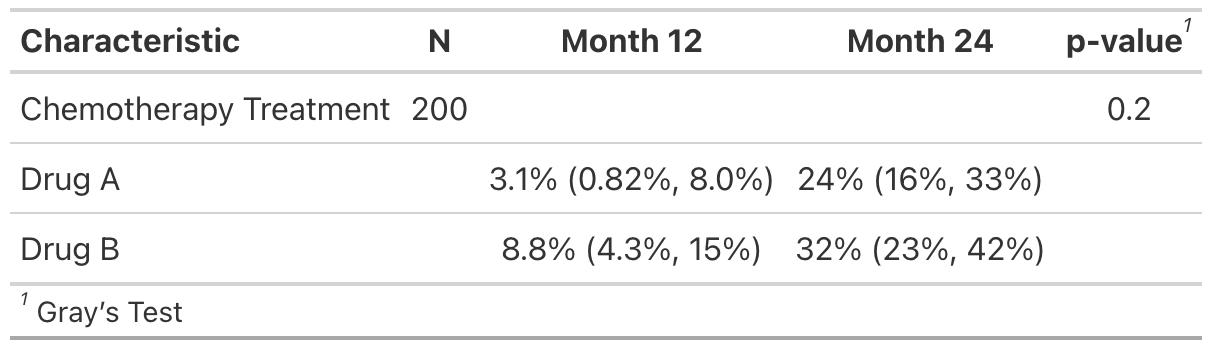 tbl_cuminc(times = c(12, 24), label_header = "**Month {time}**") %>%