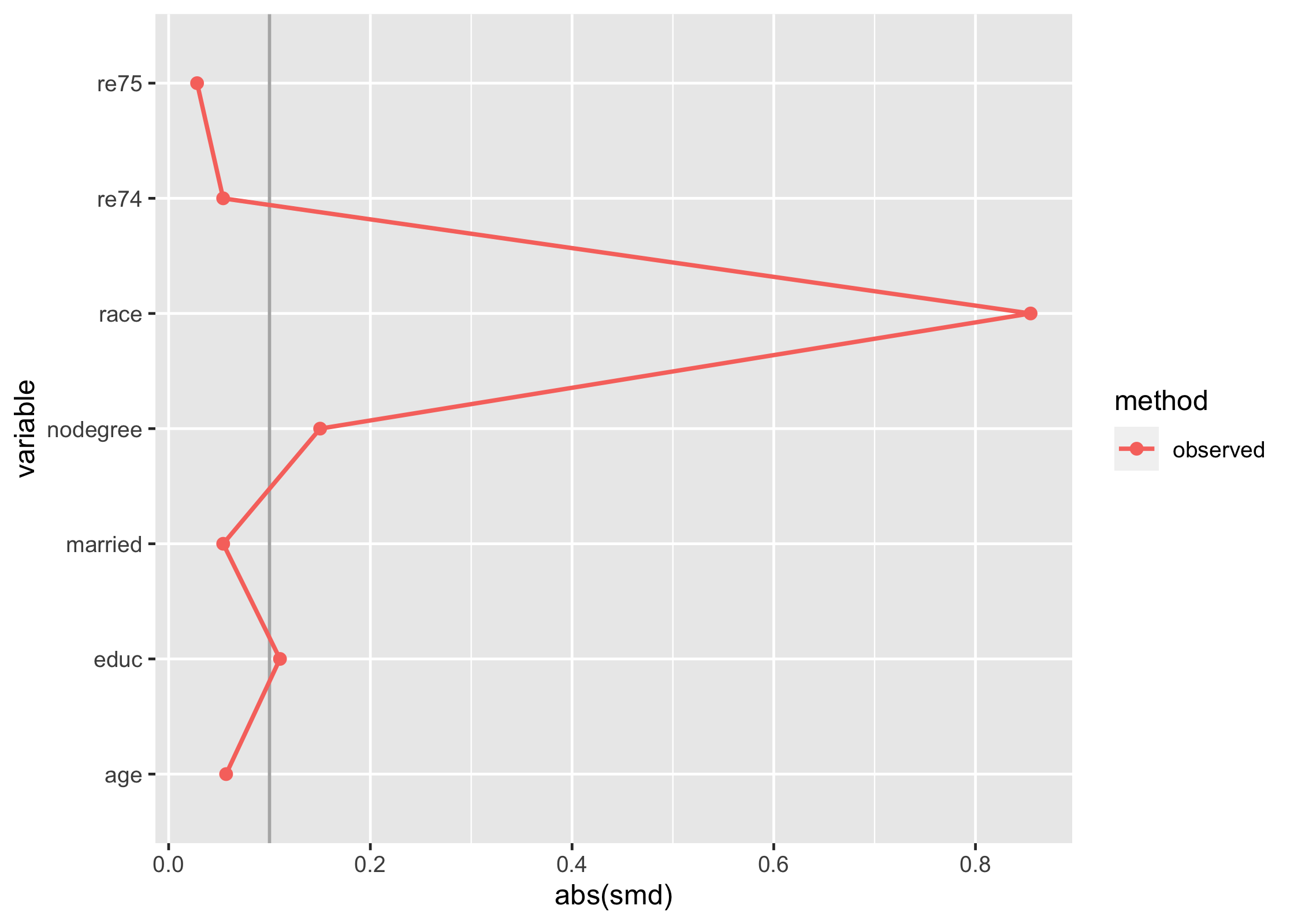 exact = ~ married + race)One option is to just look at the matched dataset with tidysmd: