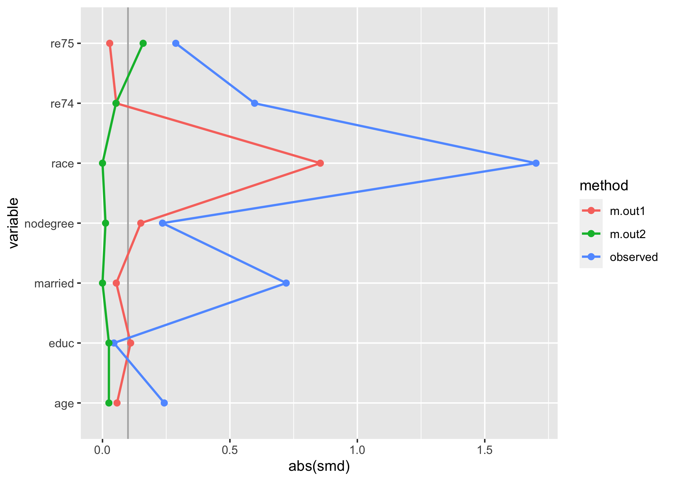 m.out2 <- matchit(treat ~ age + educ + race + nodegree +