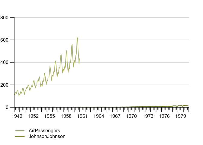 {tstools} lets you draw time series line charts that come with a legend out-of-the-box. Simply feed the tsplot() function with a list of time series.