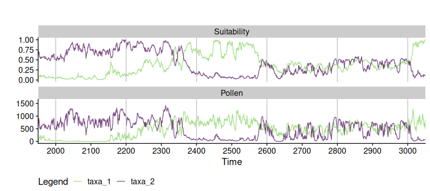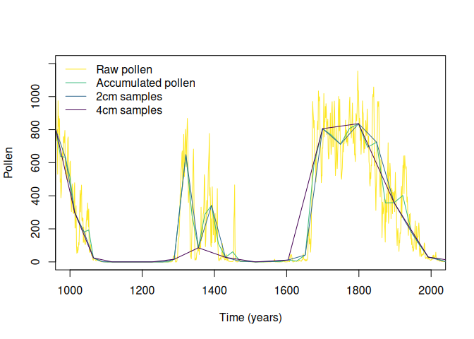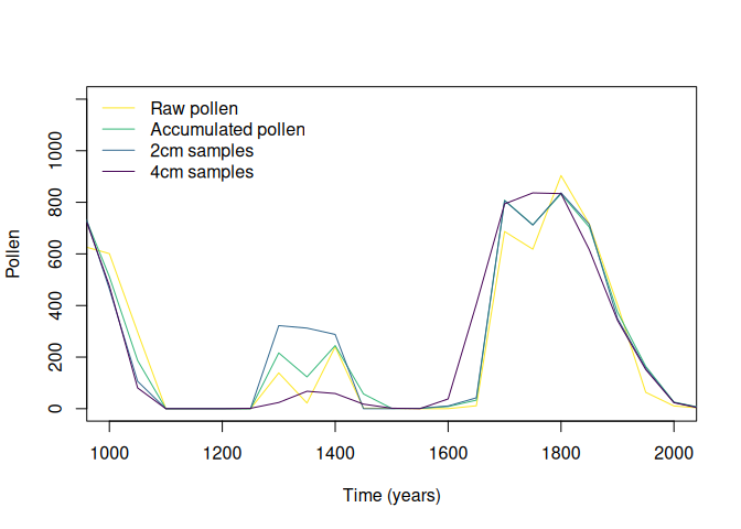)The output is a matrix-like list, where rows are simulated taxa, the first column contains the original data, the second column contains the pollen data aggregated by the accumulation rate, and the rest of the columns represent the different sampling intervals.