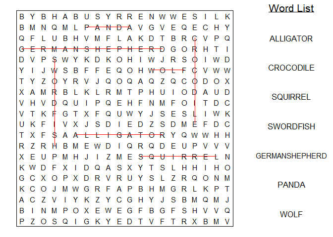 words <- c("alligator", "crocodile", "squirrel", "swordfish", "german shepherd", "panda", "wolf")