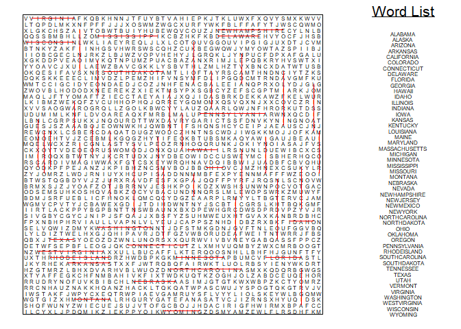 x <- wordsearch(state.name, r = 50, c = 50)