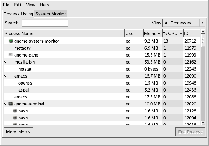 However, the GNOME System Monitor goes a step further by also including graphical representations of CPU, memory, and swap utilization, along with a tabular disk space utilization listing. An example of the GNOME System Monitor's Process Listing display appears in Figure 2-1.