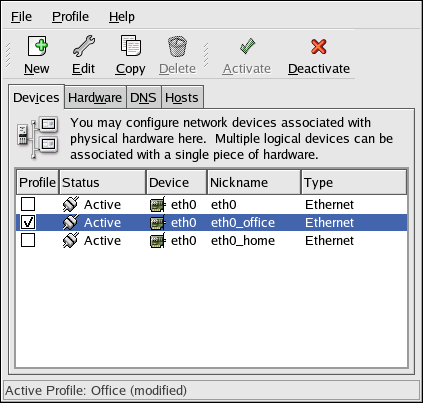 For example, Figure 19-19 shows a profile called Office with the logical device eth0_office. It is configured to activate the first Ethernet card using DHCP.
