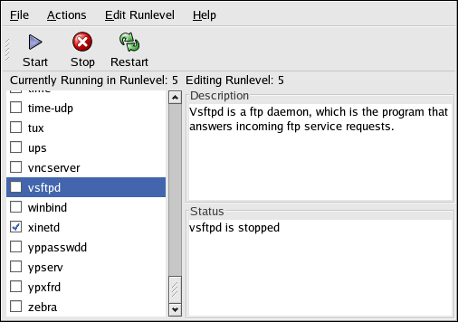 Red Hat Enterprise Linux ships with three programs designed to switch services on or off. They are the Services Configuration Tool (redhat-config-services), ntsysv, and chkconfig. For information on using these tools, refer to the chapter titled Controlling Access to Services in the Red Hat Enterprise Linux System Administration Guide.