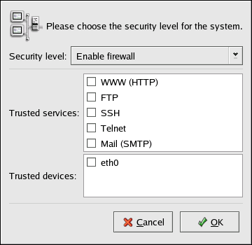 To start the application, select Main Menu Button (on the Panel) => System Settings => Security Level or type the command redhat-config-securitylevel from a shell prompt (for example, in an XTerm or a GNOME terminal).