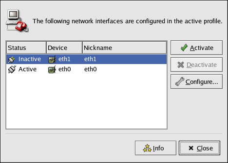Network devices can be configured to be active or inactive at boot time. For example, a network device for a modem connection is usually not configured to start at boot time; whereas, an Ethernet connection is usually configured to activate at boot time. If your network device is configured not to start at boot time, you can use the Red Hat Control Network program to activate it after boot time. To start it, select Main Menu Button (on the Panel) => System Tools => Network Device Control or type the command redhat-control-network.
