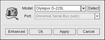 Before you begin using gtKam, you need to configure it to work with your digital camera. From the menu, choose Camera => Add Camera.... From the pop-up dialog, you can choose your camera from the drop-down list or let gtKam automatically find your camera by clicking Detect. Click Apply to accept the changes and OK to close the dialog box.