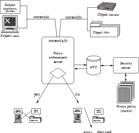 The security server need only do a look-up with a pair of contexts on a matrix of type-labeled subjects and objects, and the result is put in the access vector cache (AVC) for retrieval on subsequent matching requests.